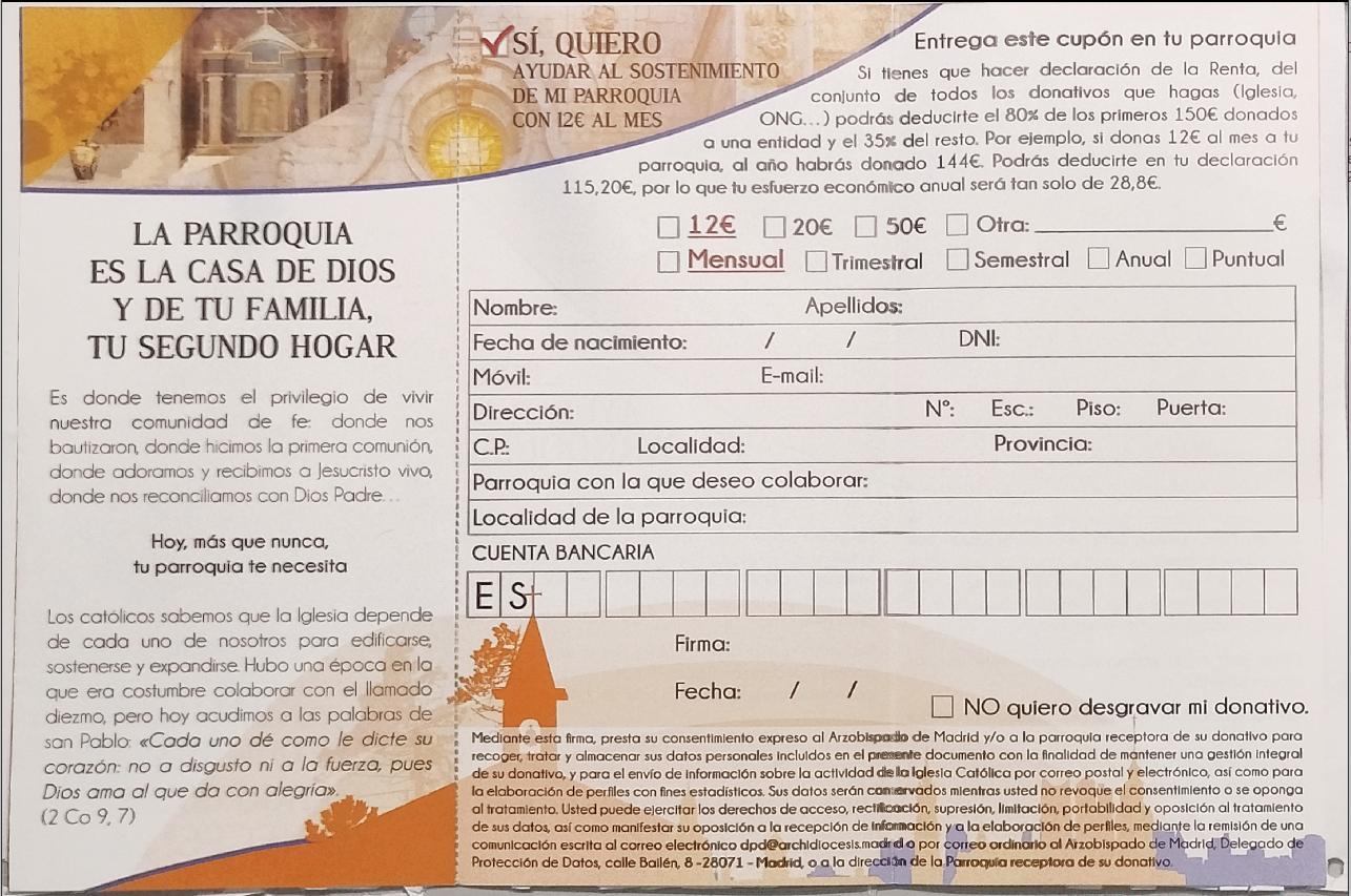 En la siguiente entrada dispone del formulario para una donación periódica. Hay que imprimirlo, rellenarlo y entregarlo en el despacho o remitirlo por correo a nuestra parroquia.